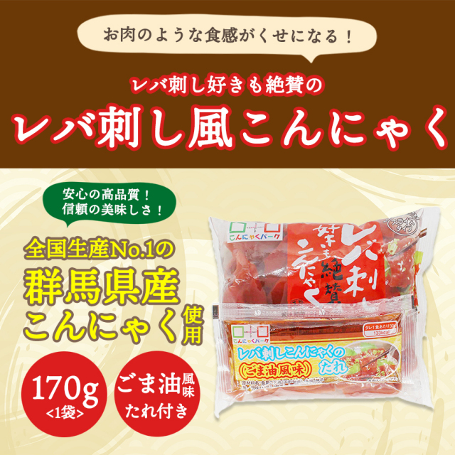 | 新たに独自開発したごま油を添付し、おいしさアップしたレバ刺し風こんにゃくです。雰囲気を楽しむもよし、お肉の代用で調理するも良しの万能こんにゃくをお召し上がりください。 |