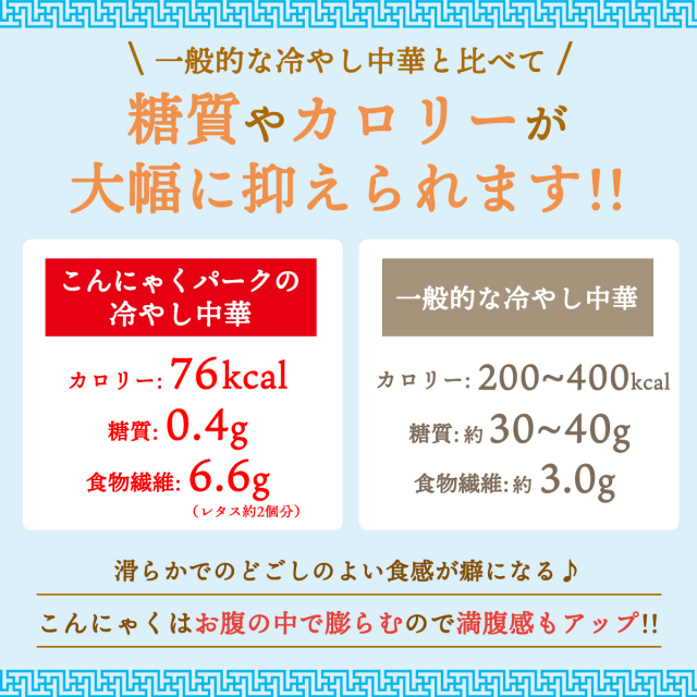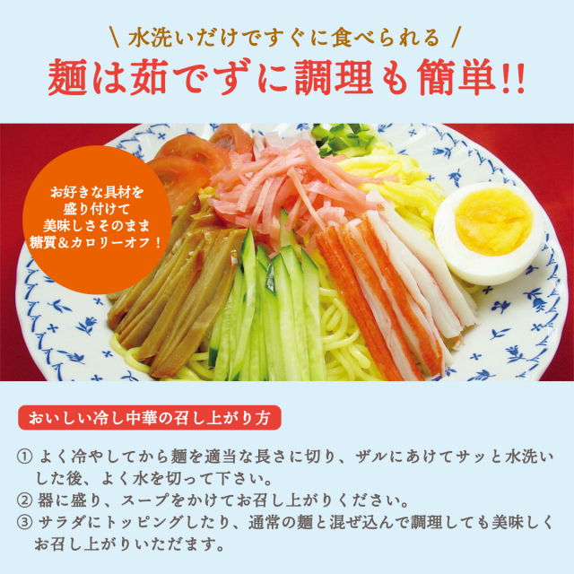 | より滑らかで、のどごしよい食感に仕上げた冷し中華こんにゃくです。食べきり一食サイズとなっています。 糖質制限が必要な方、糖質を控えたい方にぴったり。麺のカロリーは1袋たったの22Kcalなので置き換えダイエットにもおすすめです。カロリーオフでありながら食べ応えのある食事をお楽しみいただけます。手間のかからない簡単調理もポイント。軽く水洗いして器に盛り、添付の醤油スープをかけてお召し上がりいただけます。 |