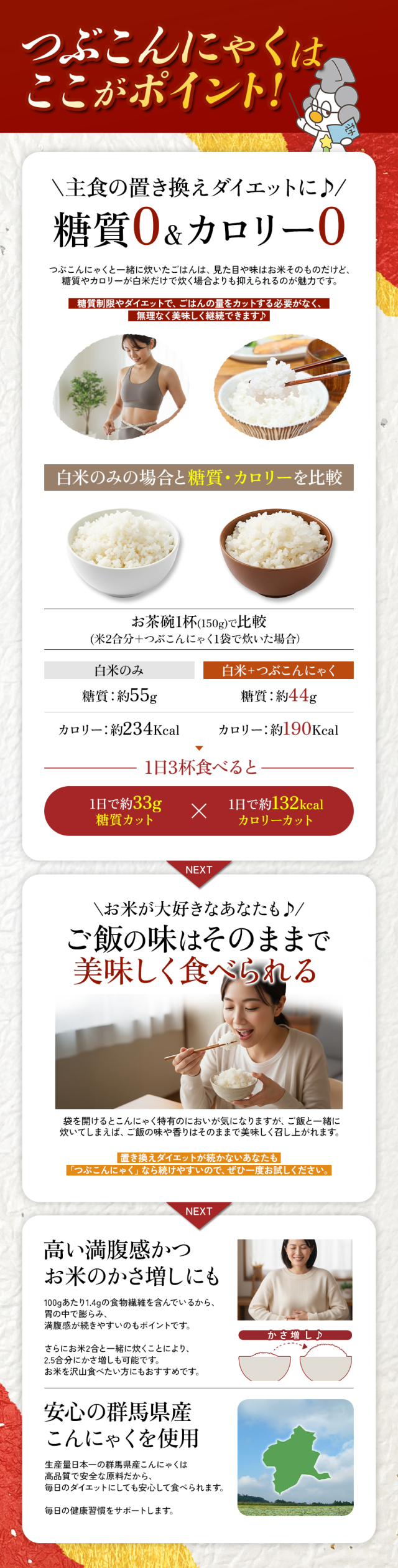 つぶこんにゃく(こんにゃく米)は、白米と一緒に炊くだけで糖質もカロリーも手軽にカットできる、ヘルシー志向の新定番。見た目はまるでお米のような粒状タイプで、炊き上がりもふっくら。白米に混ぜても違和感が少なく、しっかり“お米の食べごたえ”を楽しめます。普段のご飯を置き換えたり、かさ増ししたり、ダイエット中の方や糖質を控えたい方にもおすすめ。カロリー・糖質ゼロなのに満足感はそのまま。毎日の食卓に手軽に取り入れられます。