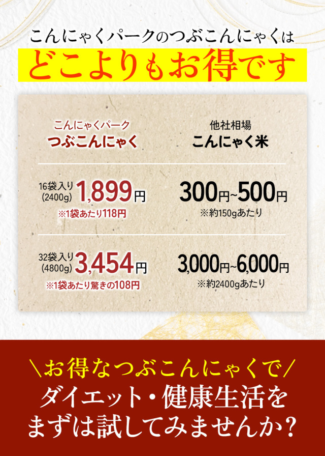 名称 |つぶこんにゃく 原材料名 |こんにゃく粉(群馬県産)、水酸化カルシウム(こんにゃく用凝固剤) 栄養成分 |【100gあたり】エネルギー:0Kcal、たんぱく質:0.2g、脂質:0.1g、炭水化物:1.6g(糖質:0.0g、食物繊維:1.4g)、食塩相当量:0.0g 内容量 |150g ×32袋 賞味期限 |製造日より120日(お届けする商品は、賞味期間の約30%以上が目安となります) 保存方法 |直射日光、高温の場所を避けて保存してください 製造者 |株式会社ヨコオデイリーフーズ 備考 |本製品製造工場では、卵・いか・ごま・大豆を含む製品を生産しています。 本品は凍らせないでください。(凍るとやせて食感が変わります) |