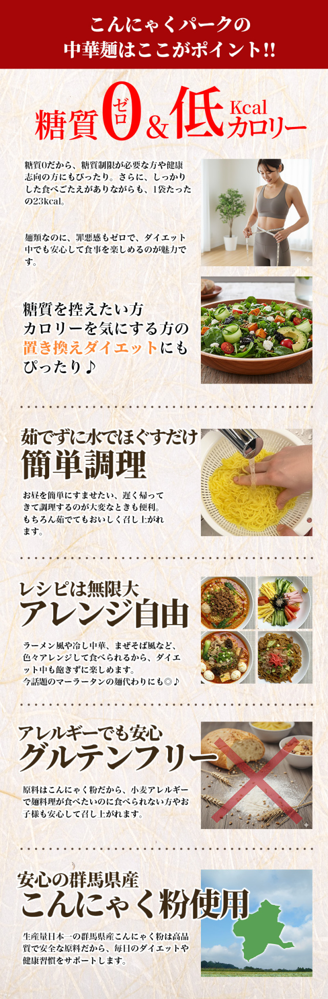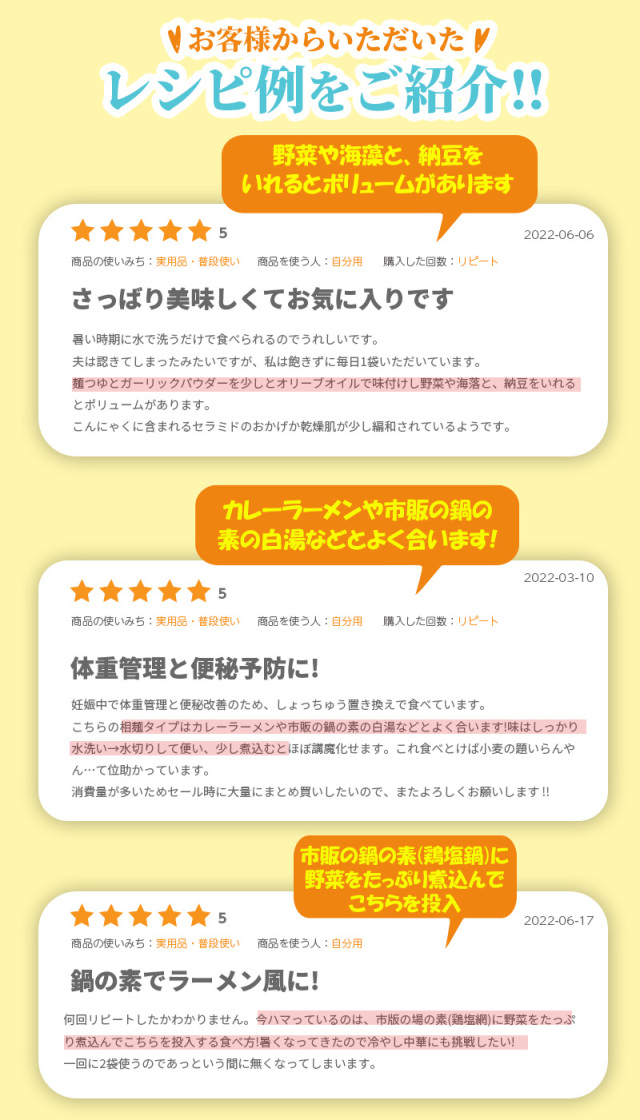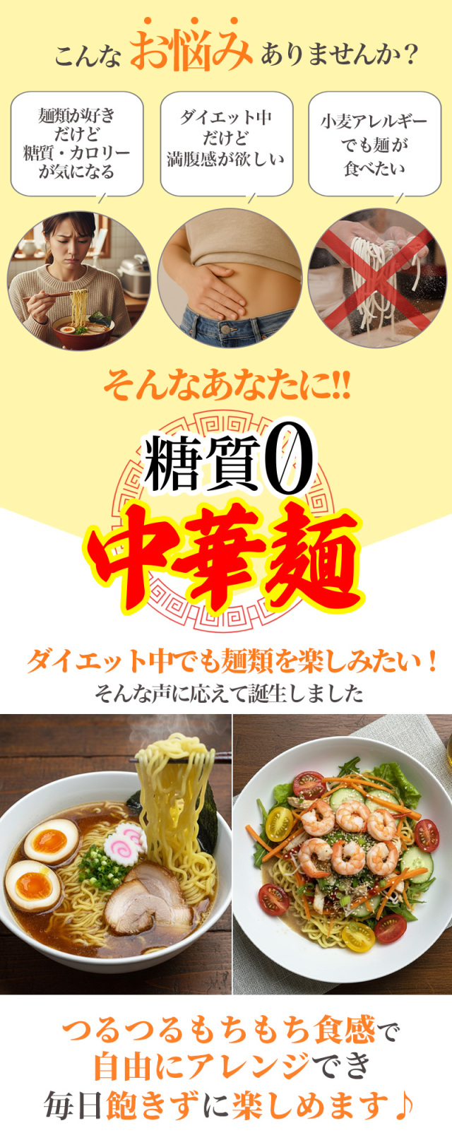 中華麺風の黄色麺タイプです。糖質0、さらにカロリーも0に近づけました。平打ちをさらに薄くし食感も小麦粉のザクザク感を意識して作り上げました。細かく切りサラダにもトッピングできます。