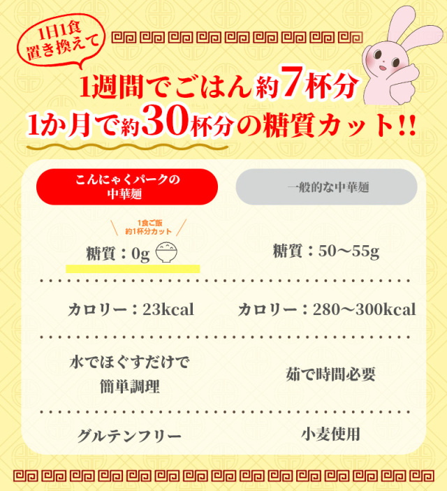 名称 |糖質0 中華麺風黄色麺タイプ 原材料名 |こんにゃく粉(群馬県産)、粉末油脂/糊料(加工でん粉)、卵殻末焼成カルシウム、水酸化カルシウム(こんにゃく用凝固剤)、カロチノイド色素、(一部に卵を含む) 栄養成分 |【180gあたり】エネルギー:23Kcal、たんぱく質:1.1g、脂質:1.6g、糖質:0g、食物繊維:7.0g、食塩相当量:0g 内容量 |180g ×40袋(1箱) 賞味期限 |製造日より120日(お届けする商品は、賞味期間の約30%以上が目安となります) 保存方法 |直射日光、高温の場所を避けて保存してください 製造者 |株式会社ヨコオデイリーフーズ 備考 |本製品製造工場では、いか・ごま・大豆を含む製品を生産しています。 |