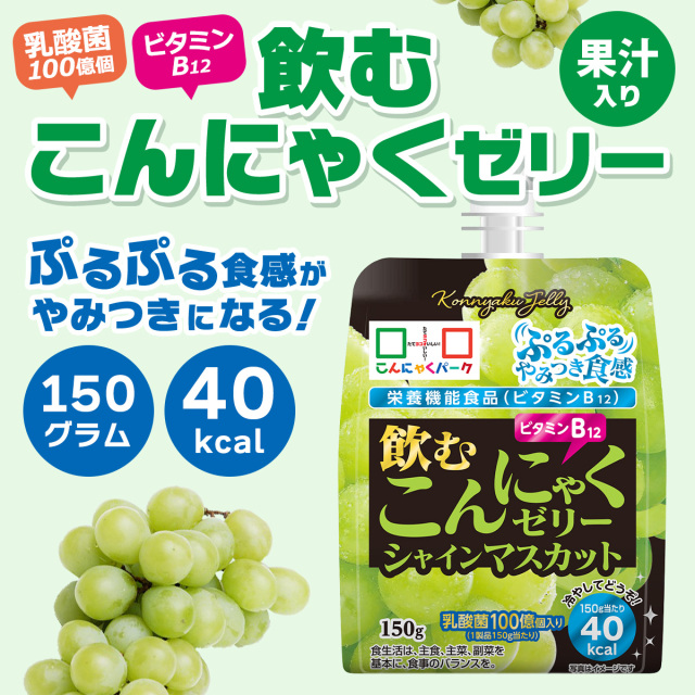 ぷるぷる食感がやみつきになる飲むこんにゃくゼリーシャインマスカット味。乳酸菌とビタミンB12を配合した栄養機能食品としてリニューアルしました♪1個40Kcalの低カロリーのため、小腹がすいたときやダイエット時、お子さまのおやつとしてもおすすめです。
