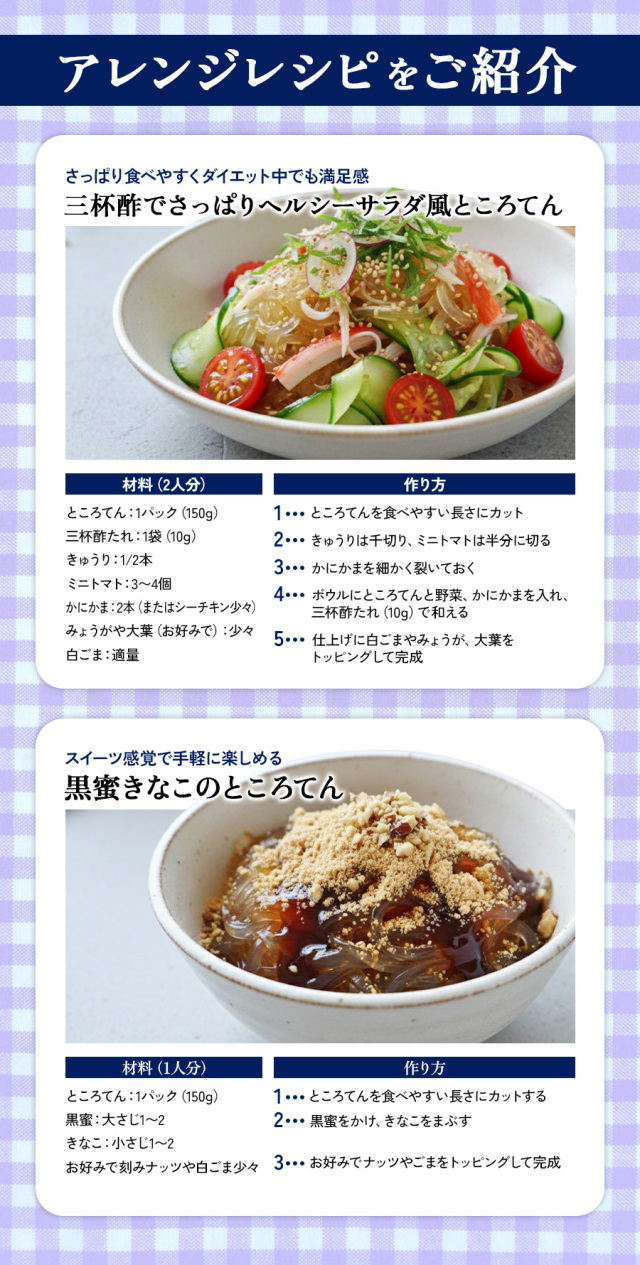 天草から造り上げたのどごしの良いところてんの三杯酢味です。低カロリー、低糖質なので、健康を気にする方やダイエット中の方にもぴったり。暑い季節や食事をさっぱりしたいときにも最適です。ところてんは便秘解消や腸内環境の改善にも役立つ食物繊維を豊富に含んています。
