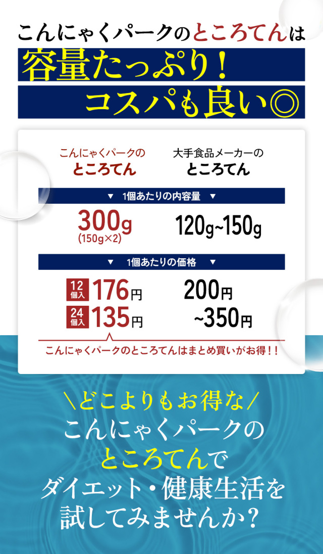 名称 |のどごしところてん三杯酢(1個2食入り) 原材料名 |【ところてん】天草(外国産)、醸造酢 【タレ】しょうゆ、砂糖・異性化液糖、砂糖、醸造酢、食塩、濃縮レモン果汁/調味料(アミノ酸等)、酸味料、(一部に小麦・大豆を含む) 栄養成分 |【1食160gあたり】エネルギー:19Kcal、たんぱく質:0.7g、脂質:0.2g、炭水化物:4.5g、食塩相当量:1.3g 内容量 |(ところてん150g×2、たれ10g×2)×24個 賞味期限 |製造日より90日(お届けする商品は、賞味期間の約30%以上が目安となります) 保存方法 |直射日光、高温の場所を避けて保存してください 製造者 |株式会社ヨコオデイリーフーズ |