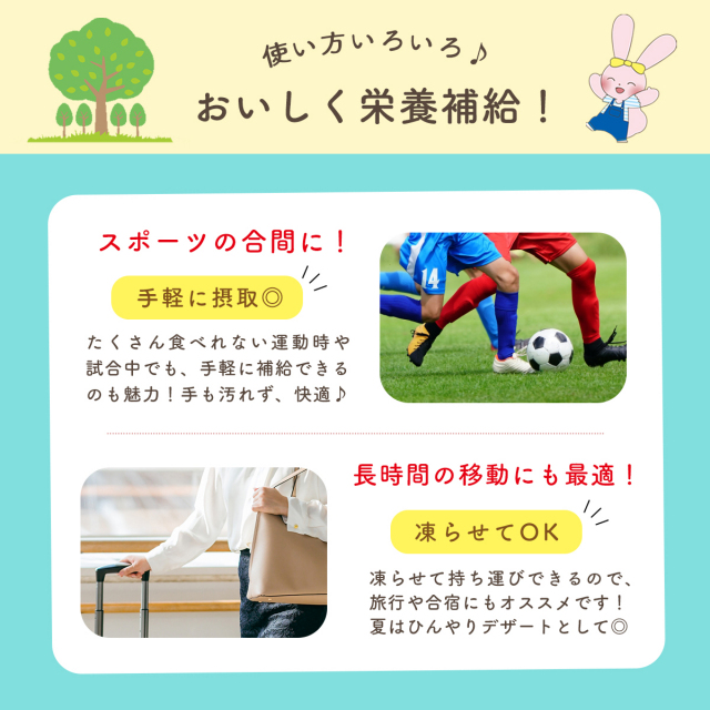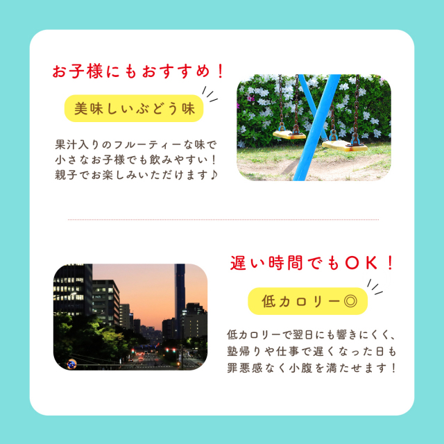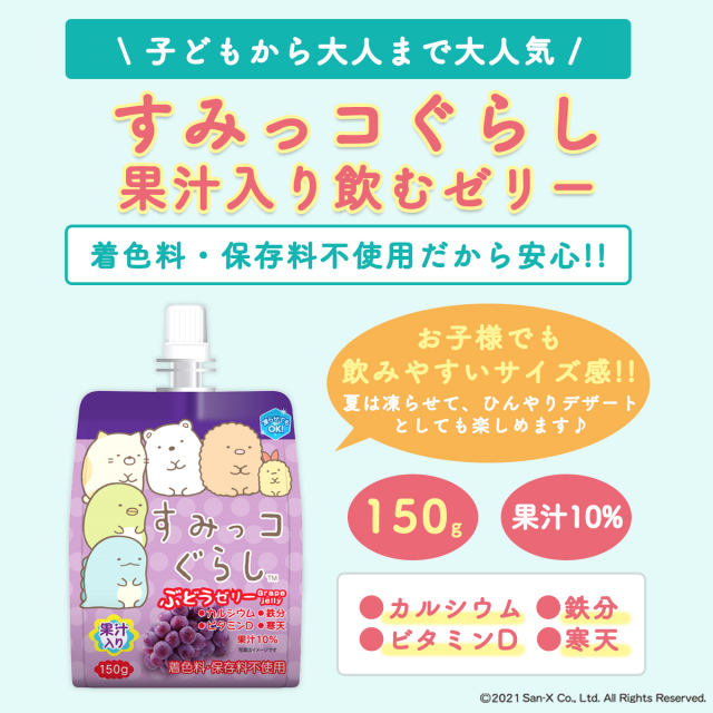 大人気のキャラクター「すみっコぐらし」の果汁入り飲むゼリーのぶどう味。お子様も飲みやすいサイズ感で、カルシウム、鉄分、ビタミンD、寒天をプラスしています。夏は凍らせても美味しく召し上がれます。 |