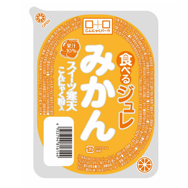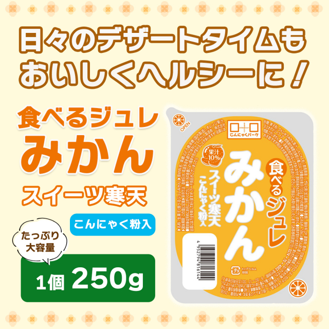 ヘルシーなこんにゃく粉と寒天入りの新食感デザート「食べるジュレスイーツ寒天」のみかん味。みんなでシェアできるたっぷり250gの大容量サイズです。 |