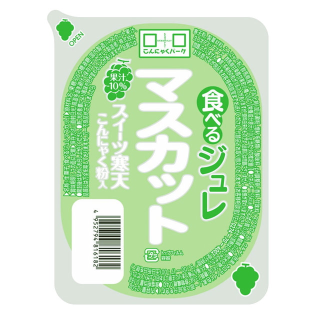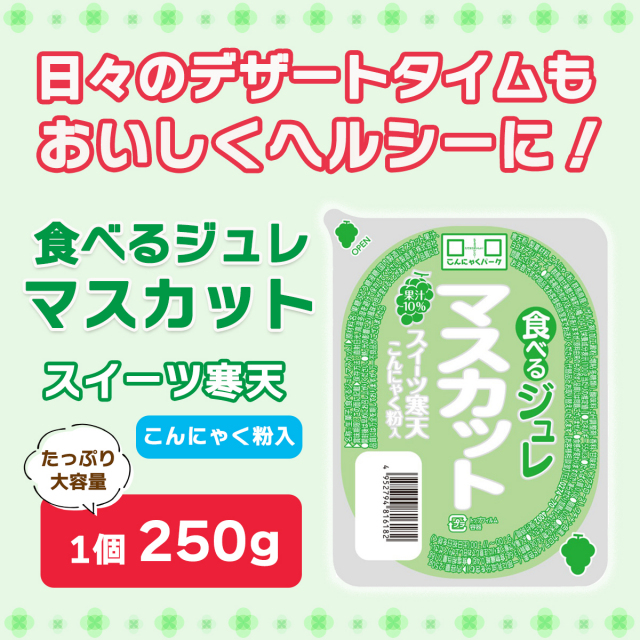 ヘルシーなこんにゃく粉と寒天入りの新食感デザート「食べるジュレスイーツ寒天」のマスカット味。みんなでシェアできるたっぷり250gの大容量サイズです。