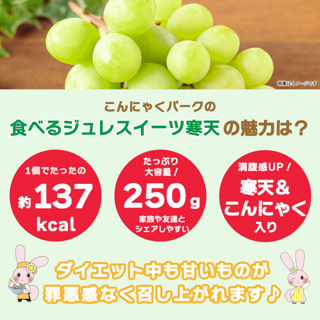 ヘルシーなこんにゃく粉と寒天入りの新食感デザート「食べるジュレスイーツ寒天」のマスカット味。みんなでシェアできるたっぷり250gの大容量サイズです。