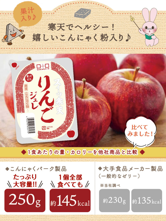 ヘルシーなこんにゃく粉と寒天入りの新食感デザート「スイーツ寒天りんごジュレ」。みんなでシェアできるたっぷり250gの大容量サイズです。 |