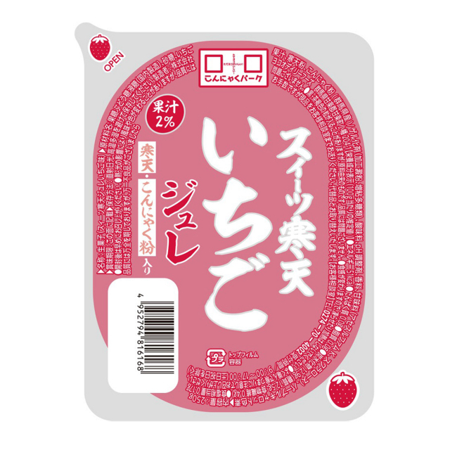ヘルシーなこんにゃく粉と寒天入りの新食感デザート「スイーツ寒天いちごジュレ」。みんなでシェアできるたっぷり250gの大容量サイズです。 |