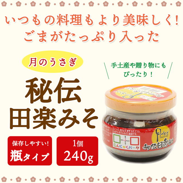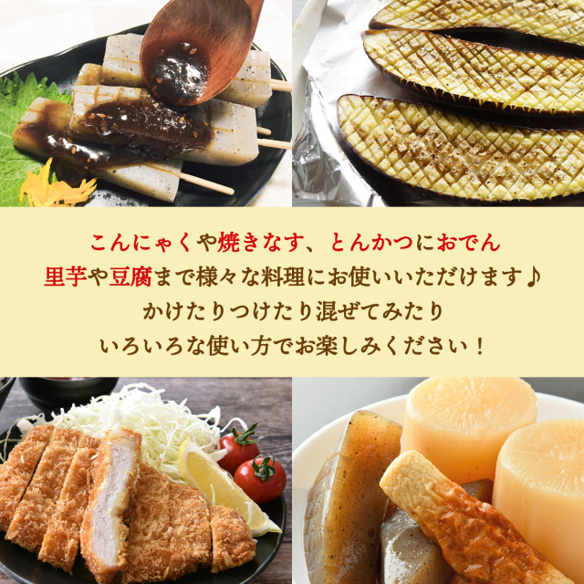 | ごまがたっぷりと入った秘伝田楽みそ。コンニャク、焼きなす、里芋、もち、とうふ、とんかつ、おでんなどの様々な料理にかけて楽しめます。