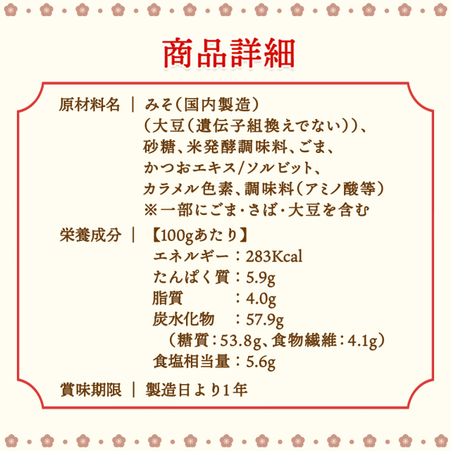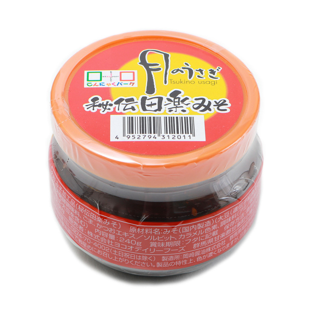 名称 |月のうさぎ 秘伝田楽みそ 原材料名 |みそ(国内製造)(大豆(遺伝子組換えでない))、砂糖、米発酵調味料、ごま、かつおエキス/ソルビット、カラメル色素、調味料(アミノ酸等)、(一部にごま・さば・大豆を含む) 栄養成分 | 【100gあたり】エネルギー:283Kcal、たんぱく質:5.9g、脂質:4.0g、炭水化物:57.9g(糖質:53.8g、食物繊維:4.1g)、食塩相当量:5.6g 内容量 |240g ×1個 賞味期限 |製造日より1年 保存方法 |開封後は要冷蔵にてお早めにお召し上がりください。製品の特性上、色が濃くなりますが、品質上問題ありません。 製造者 |岡崎醤油株式会社 群馬県高崎市新町2085番地 販売者 |株式会社ヨコオデイリーフーズ |