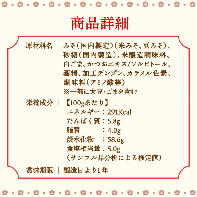 名称 |月のうさぎ 田楽みそ 極みそだれ 原材料名 |みそ(国内製造)(米みそ、豆みそ)、砂糖(国内製造)、米醸造調味料、白ごま、かつおエキス/ソルビトール、酒精、加工デンプン、カラメル色素、調味料(アミノ酸等)、(一部に大豆・ごまを含む) 栄養成分 | 【100gあたり】エネルギー:291Kcal、たんぱく質:5.8g、脂質:4.0g、炭水化物:58.6g、食塩相当量:5.0g(サンプル品分析による推定値) 内容量 |330g ×1個 賞味期限 |製造日より1年 保存方法 |開封後は要冷蔵にてお早めにお召し上がりください。 製造者 |山印醸造株式会社 丸子工場 長野県上田市腰越1544 販売者 |株式会社ヨコオデイリーフーズ 備考 |みそに使用している大豆は、遺伝子組換えの混入を防ぐため分別生産流通管理を行っています。 |