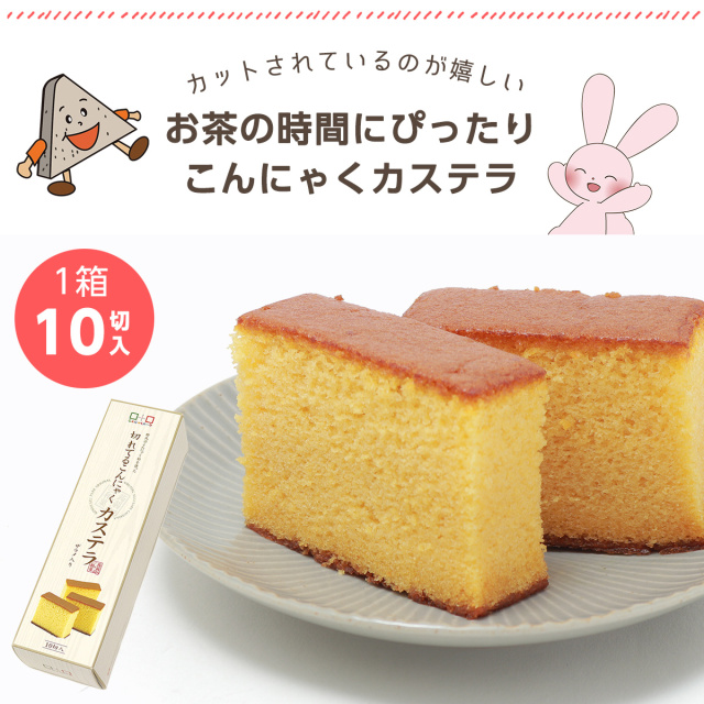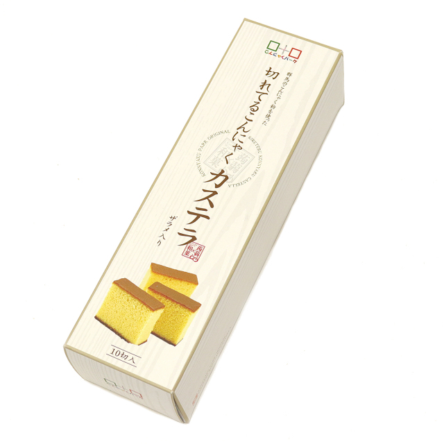 | 群馬県産のこんにゃく粉を使用したザラメ入りのこんにゃくカステラ。10切に食べやすくカットされています。お茶やおやつの時間にぴったりな一品です。