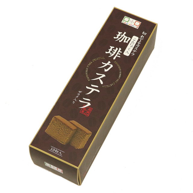 | こんにゃく粉を使用したザラメ入りの珈琲カステラ。10切に食べやすくカットされています。お茶やおやつの時間にぴったりな一品です。