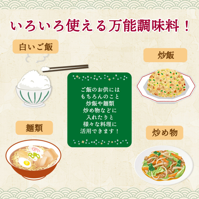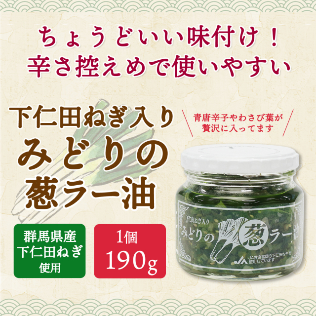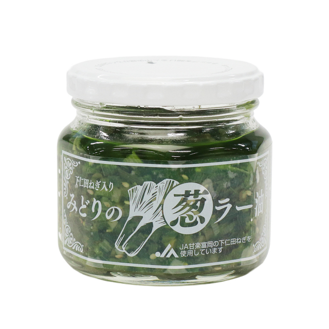 | 下仁田ネギと青唐辛子、わさび葉が入ったみどりの葱ラー油。ご飯のお供にはもちろん、炒飯や麺類、炒め物などに入れたりなど、様々な料理で美味しく召し上がれます。 |