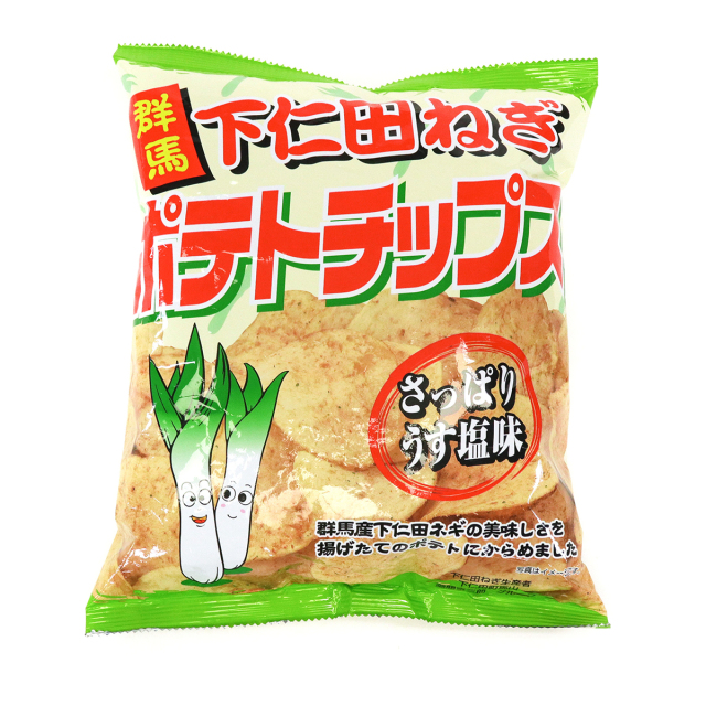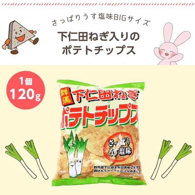 | さっぱりうす塩味で120gのBIGサイズの下仁田ねぎポテトチップス。下仁田ねぎの美味しさを揚げたてポテトにからめました。おやつはもちろん、お酒のおつまみにもおすすめです。