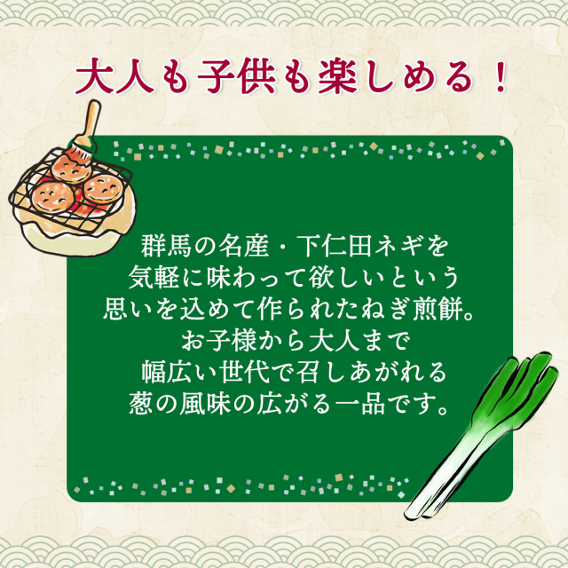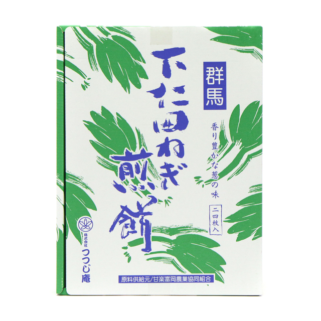 | 群馬の名産を気軽に味わって欲しいという思いを込めて作られた下仁田ねぎ煎餅。お子様から大人まで幅広い世代で召しあがれる葱の風味の広がる一品です。 |