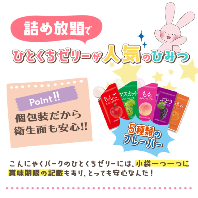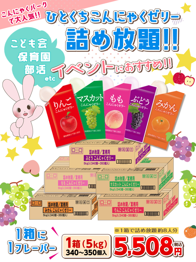 | 子供会やお祭りなどのイベントで楽しめる詰め放題ひとくちこんにゃくゼリーです。手軽に食べられる個包装タイプのこんにゃくゼリーなので、手も汚れずにお子様にぴったり!部活や福祉施設、給食などの業務用にもおすすめです。