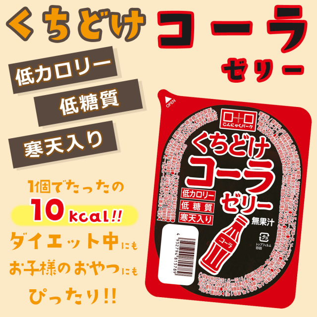 | 寒天入りのくちどけの良いゼリー「くちどけコーラゼリー」。低カロリー、低糖質なので、ダイエット中の方も罪悪感なく召し上がれます。ちょっと小腹がすいたときやお子様のおやつにもぴったり。たっぷり240gでシェアして食べても◎♪ |