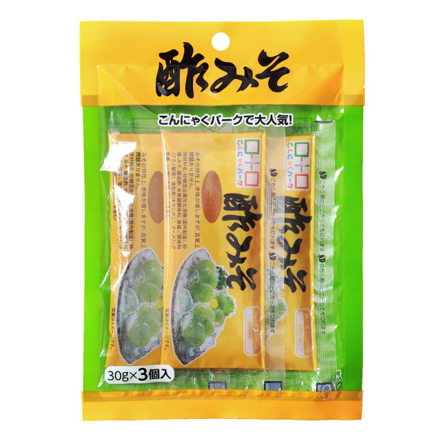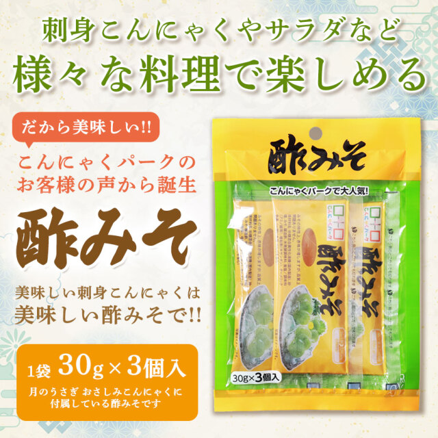 | 「月のうさぎ おさしみこんにゃく」に付属している酢みそ(1袋3個入)です。こんにゃくパークご来場のお客様からの反響が大きく単品での販売を開始しました!さしみこんにゃくにかければ、よりおいしく召し上がれ、サラダや和え物など様々な料理にもかけて楽しめます。 |
