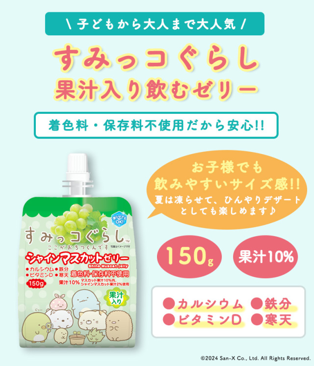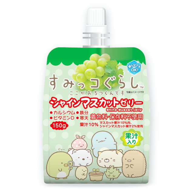 | 大人気のキャラクター「すみっコぐらし」の果汁入り飲むゼリーのシャインマスカット味。お子様も飲みやすいサイズ感で、カルシウム、鉄分、ビタミンD、寒天をプラスしています。夏は凍らせても美味しく召し上がれます。