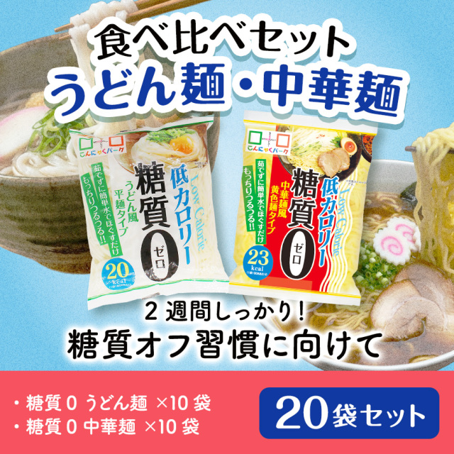 こんにゃくパークの人気商品「糖質0麺 うどん風平麺タイプ」「糖質0麺 中華麺風黄色麺タイプ」の食べ比べセットです。糖質0かつ低カロリーで日々の食事をヘルシーに楽しめます。