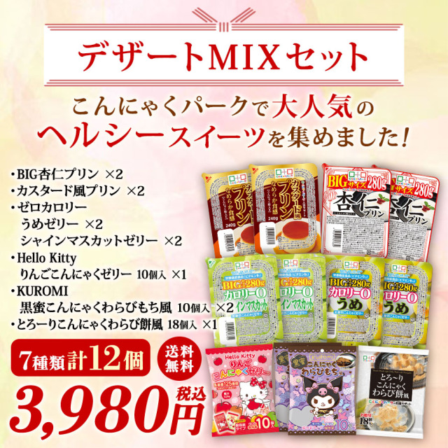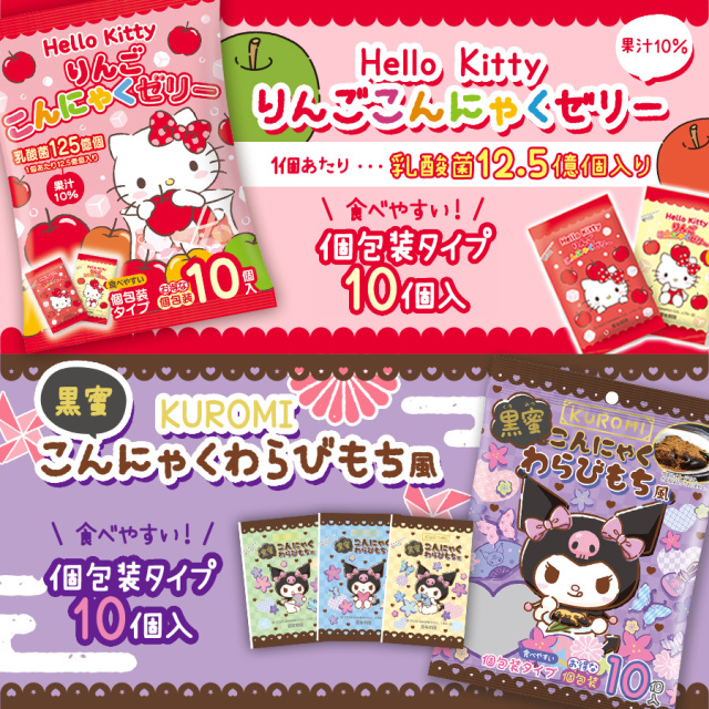| こんにゃくパークの人気のヘルシーデザートの詰め合わせセットです!定番のカップゼリーやプリン、Hello KittyとKUROMIのひとくちタイプのミニゼリー、ねっとりとした食感と軽やかな甘さが特徴のとろーりこんにゃくわらび餅を集めました。低カロリーだから、甘いものが食べたいときも罪悪感なく召し上がれるのが嬉しい!ぜひこの機会にお試しください♪ |