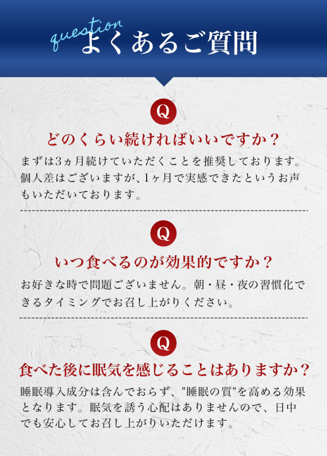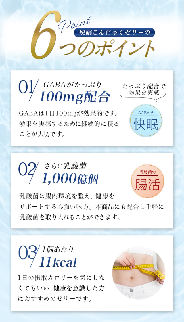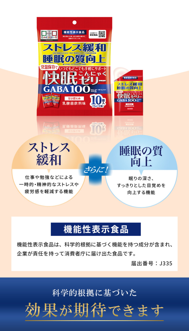 名称 |快眠 こんにゃくゼリー 10個入 原材料名 |果糖ぶどう糖液糖(国内製造)、砂糖、GABA、寒天粉、粉末油脂、殺菌乳酸菌、こんにゃく粉 / ゲル化剤(加工澱粉、増粘多糖類)、グリシン、酸味料、pH調整剤、香料、甘味料(アセスルファムK、スクラロース)、カラメル色素、(一部に乳成分を含む) 栄養成分 |【1個15gあたり】エネルギー:11Kcal、たんぱく質:0.3g、脂質:0.0g、炭水化物:2.5g、食塩相当量:0.03g、機能性関与成分:GABA 100mg、乳酸菌1000億個 内容量 |10個入(1個15g)×6袋 賞味期限 |1年 保存方法 |直射日光、高温の場所を避けて保存してください 広告文責 |株式会社ギャレリア・ニズム 0120-978-852 メーカー |株式会社ヨコオデイリーフーズ 原産国 |日本 商品区分 |機能性表示食品 届出番号 |J335 届出表示 |本品にはGABAが含まれます。GABAは仕事や勉強などによる一時的・精神的なストレスや疲労感を軽減する機能、睡眠の質(眠りの深さ、すっきりとした目覚め)を向上する機能があることが報告されています。 備考 |●1日当たりの摂取目安量:1個(15g) ●摂取の方法:そのままお召し上がりください。 ●本品は、疾病の診断、治療、予防を目的としたものではありません。 ●本品は、疾病に罹患している者、未成年者、妊産婦(妊娠を計画している者を含む。)及び授乳婦を対象に開発された食品ではありません。 ●疾病に罹患している場合は医師に、医薬品を服用している場合は医師、薬剤師に相談してください。 ●体調に異変を感じた際は、速やかに摂取を中止し、医師に相談してください。 【摂取上の注意】 ●妊娠中、授乳中の方、乳幼児及び小児のご利用はお控えください。 ●食物アレルギーのある方は、原材料名をご参照の上お召し上がりにならないでください。 ●降圧剤を服用している方は医師、薬剤師にご相談ください。 ●開封時に切り口で手を切らないようにご注意ください。 ●ゼリーの水分が飛び出す恐れがありますのでご注意ください。 ●本品は、事業者の責任において特定の保険の目的が期待できる旨を表示するものとして、消費者庁長官に届出されたものです。ただし、特定保健用食品と異なり、消費者庁長官による個別審査を受けたものではありません。 |