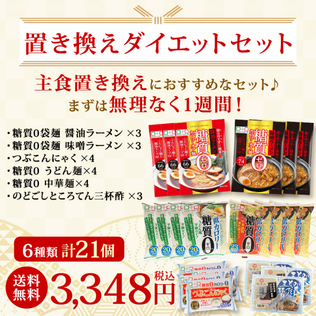 | 食事のカロリーを抑えたい方、糖質制限をしている方にぴったりの「置き換えダイエットセット」。この詰め合わせセットには、満足感たっぷりのこんにゃく麺(うどん・ラーメン・中華麺)、ご飯を一緒に炊いて糖質ダイエットが可能なこんにゃく米、さっぱり美味しいところてんが入っています。まずは1週間から、毎日の食事に取り入れてみてはいかがでしょうか。 |