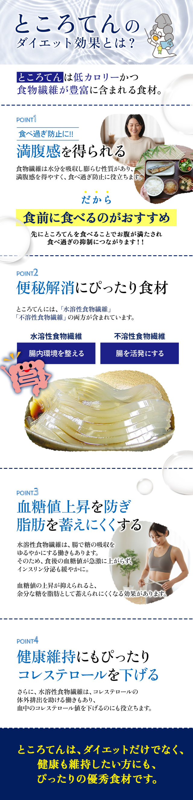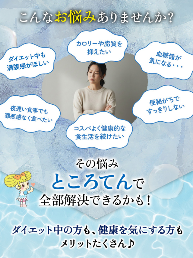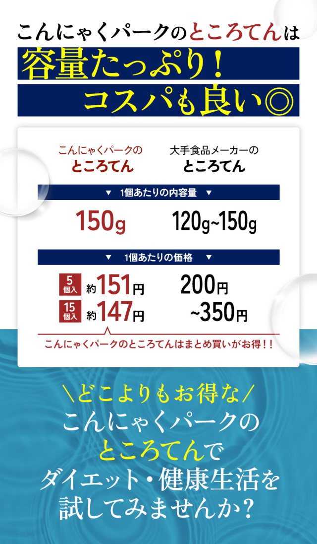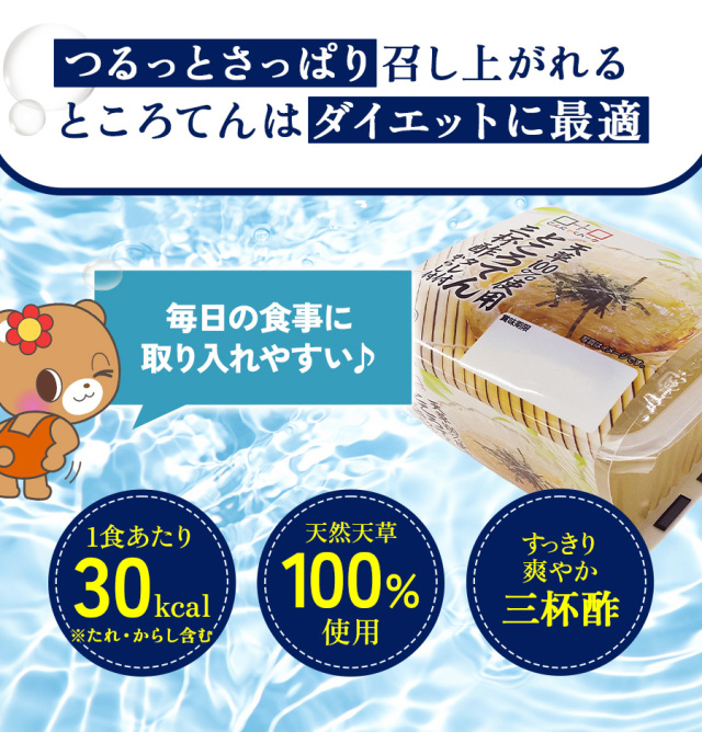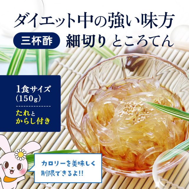 | 天草から造り上げた細切りタイプののどごしの良いところてんです。爽やかな三杯酢のたれとからし付き。低カロリー、低糖質なので、健康を気にする方やダイエット中の方にもぴったり。暑い季節や食事をさっぱりしたいときにも最適です。ところてんは便秘解消や腸内環境の改善にも役立つ食物繊維を豊富に含んています。 |