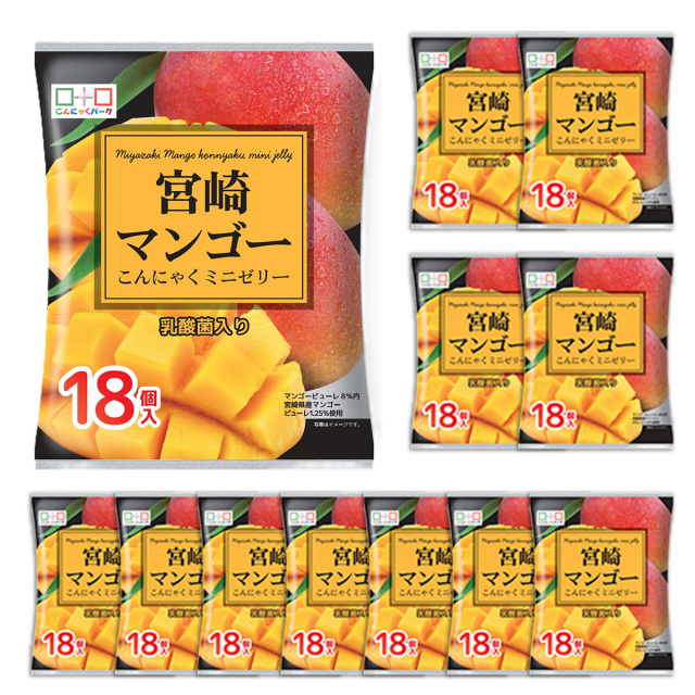 | おやつや小腹が空いたときに手軽に食べられる宮崎マンゴーこんにゃくミニゼリー。個包装1個あたり乳酸菌10億個入り。冷蔵庫で冷やせば、さらに美味しくお召し上がりいただけます。持ち運びに便利な個包装タイプのゼリーが1袋18個入っています。 |