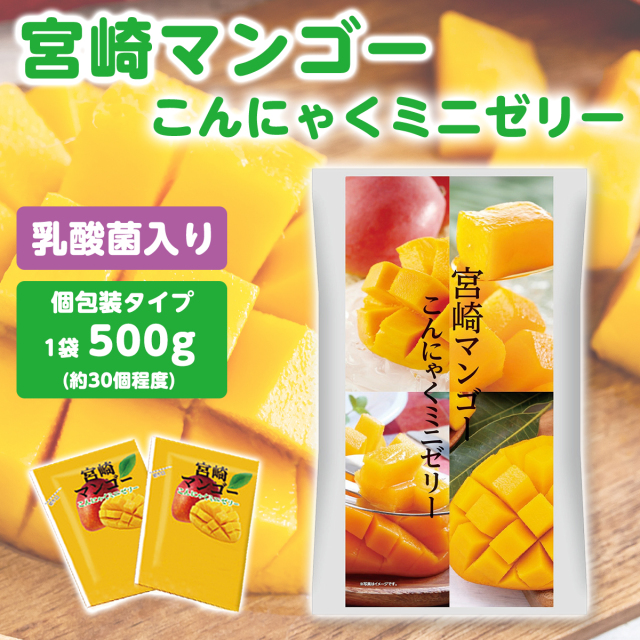 | おやつや小腹が空いたときに手軽に食べられる宮崎マンゴーこんにゃくミニゼリー。冷蔵庫で冷やせば、さらに美味しくお召し上がりいただけます。持ち運びに便利な個包装タイプのゼリーが1袋約30個程度入っています。(重量で管理しているため、個数は異なる場合があります。)