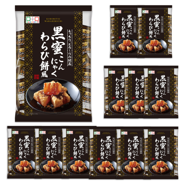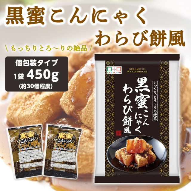 | おやつや小腹が空いたときに手軽に食べられる黒蜜こんにゃくわらび餅風。冷蔵庫で冷やせば、さらに美味しくお召し上がりいただけます。持ち運びに便利な個包装タイプのゼリーが1袋約30個程度入っています。(重量で管理しているため、個数は異なる場合があります。) |