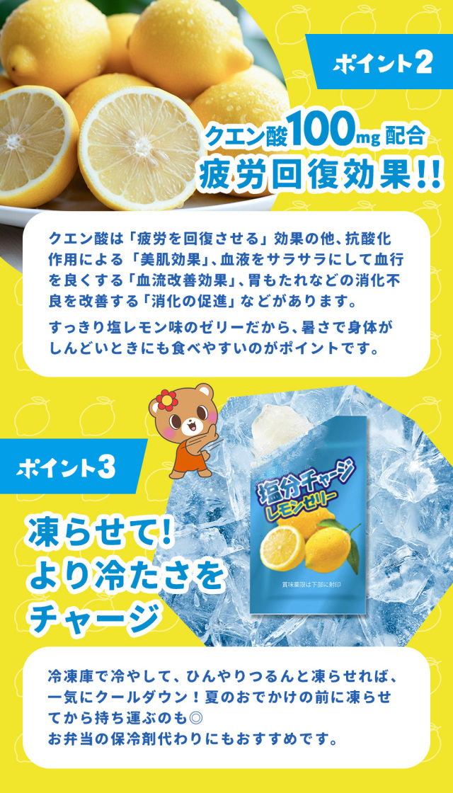 | 暑い季節の運動や外出時、屋外の現場作業や農作業時などで塩分補給に便利な個包装タイプの塩分チャージ塩レモンゼリー。こちらは1袋450g(約30個)入りの業務用サイズです。塩分補給にぴったりなクエン酸、カリウム入り。常温保存ができるから、まとめ買いをしてもいつでも使用できるようにストックも可能です。凍らせれば、塩分と冷たさを同時にチャージができ、熱中症対策にぴったりです! |